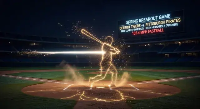 Detroit Tigers outfield prospect Max Clark faced Pittsburgh Pirates pitching prospect Seth Hernandez as the leadoff batter in a Spring Breakout exhibition game on March 20, 2026, at LECOM Park in Bradenton, Florida. Hernandez's first pitch, clocked at 102.4 mph and located above the zone, prompted an audible reaction from Clark, who was captured on video mouthing "What the f---."[1]